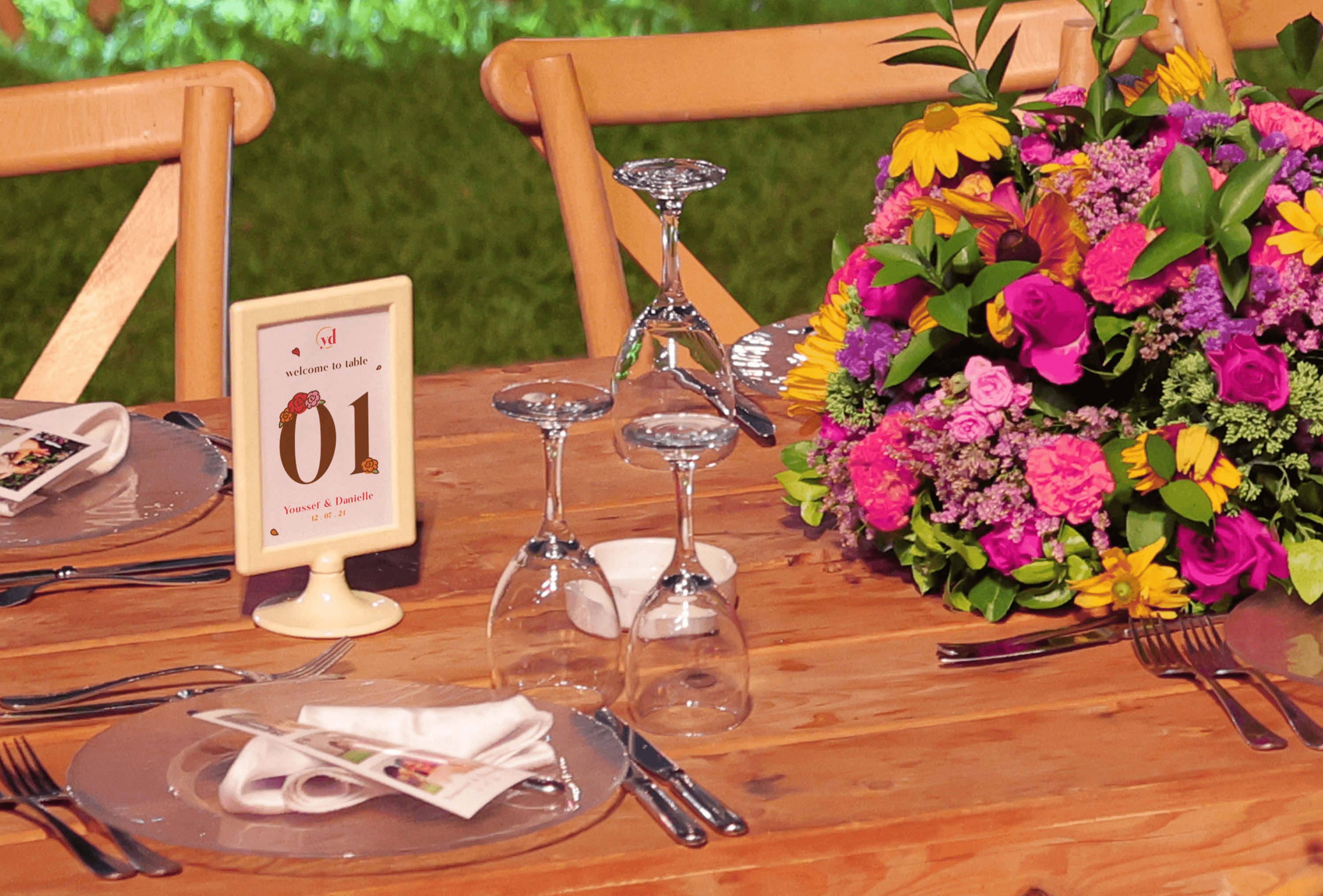 The couple were looking for wedding branding that reflects their lively, adventurous personalities and love for all things fun ! The wedding was held outdoors, so the designs needed to embrace the natural beauty of the setting while being bold and vibrant.
